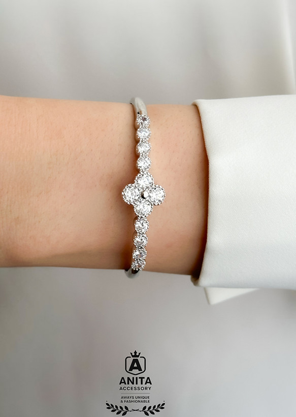 بنگل لوکس ونکلیف با طراحی نمادین چهاربرگ خوششانس و ردیف نگینهای درخشان تراشبرلیان، جلوهای مجلل و ماندگار به استایل شما میبخشد. این مدل دارای قفل جانبی ایمن با مکانیزم باز و بستهشدن آسان است که امنیت و راحتی استفاده را تضمین میکند. آبکاری نقرهپلاتین باکیفیت، ضدحساسیت و مقاوم در برابر تغییر رنگ، مناسب استفاده روزانه و مهمانیهاست. در طراحی این بنگل، جزئیات ظریف هنری و نماد خوششانسی ترکیب شده تا آن را به هدیهای ارزشمند و اکسسوریی بیهمتا برای شما تبدیل کند.