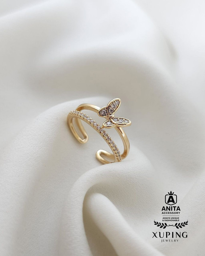 انگشتر دو لاین پروانه نگین ژوپینگ،رنگ ثابت،مشابه طلا،ضد حساسیت،نگین مخراجکاری شده،برند معتبر ژوپینگ